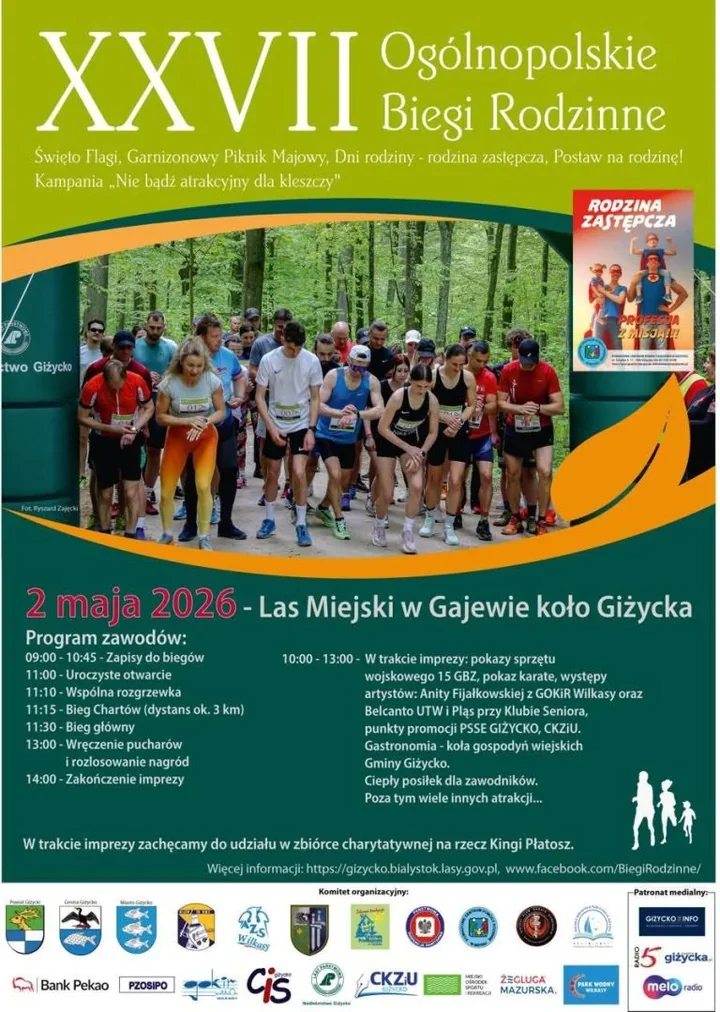 W Lesie Miejskim w Gajewie pod Giżyckiem szykuje się przedpołudnie, w którym bieganie ma iść ramię w ramię z piknikiem, muzyką i rodzinną atmosferą. 2 maja odbędą się tam XXVII Ogólnopolskie Biegi Rodzinne, wydarzenie łączące sport, majowe święta i działania edukacyjne. Na trasie pojawią się zarówno najmłodsi, jak i dorośli, a obok startu będzie można zobaczyć wojskowy sprzęt, pokaz karate i stoiska przygotowane przez lokalne organizacje. To nie będzie zwykły bieg. Raczej dzień, w którym las na chwilę przejmie rytm miejskiego festynu.